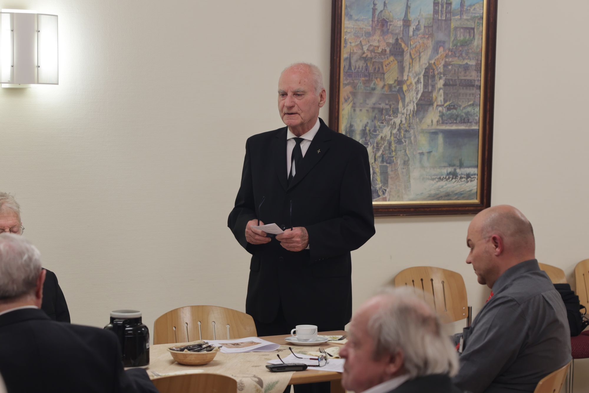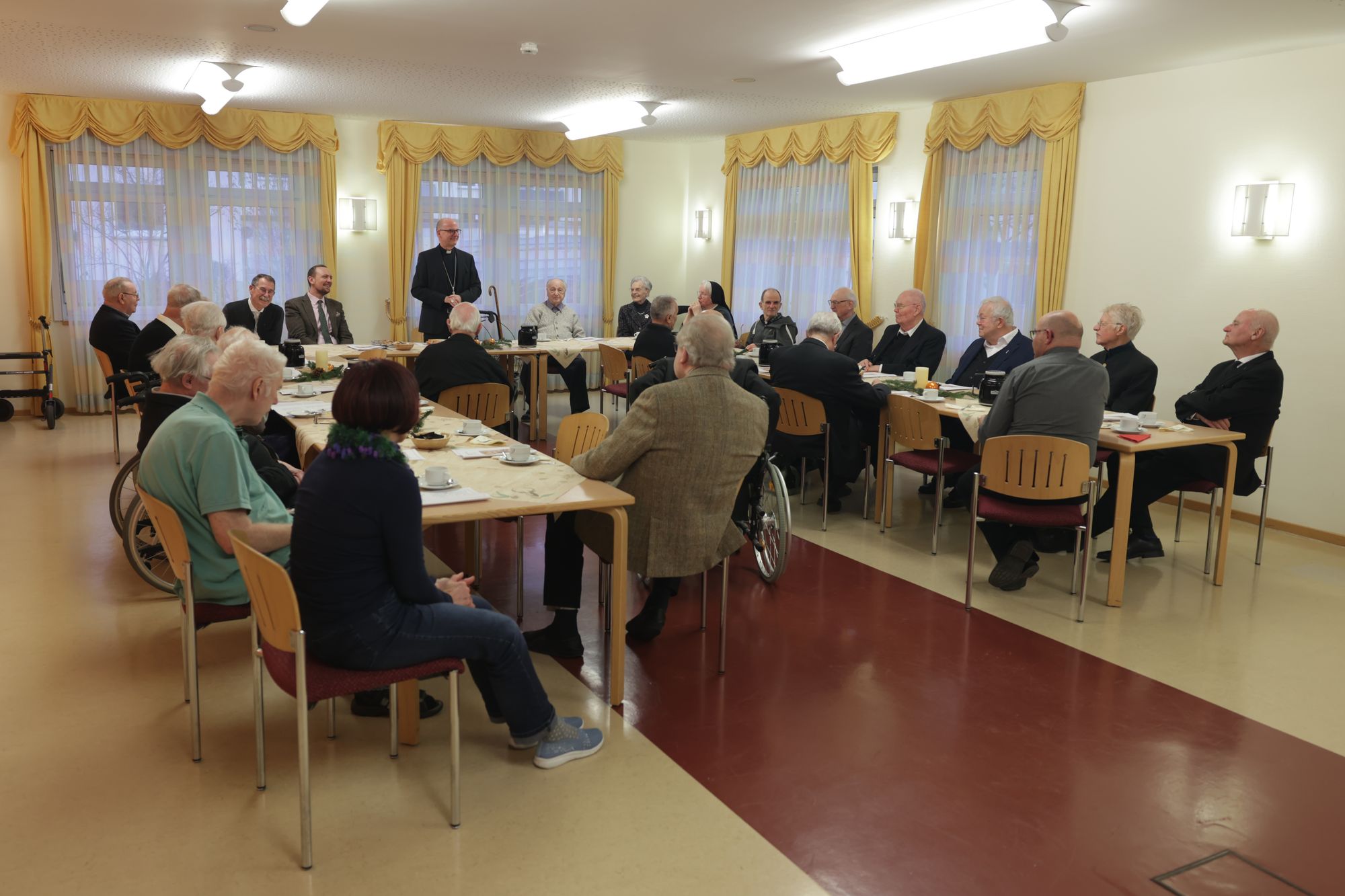 Der Bischof feierte mit den Senioren eine Andacht. Im Anschluss nahm er sich bei Kaffee und Kuchen viel Zeit für persönliche Gespräche. „Es ist immer eine schöne Gelegenheit, Danke zu sagen für Ihren vieljährigen Dienst im Bistum und in der Seelsorge“, sagte der Bischof. Die Geburtskirche Jesu in Betlehem habe eine so kleine Pforte, dass man sich „kleinmachen“ müsse, um hindurchzukommen. Sie werde im Volksmund auch „Pforte der Demut“ genannt. „Die enge Pforte gibt es oft im Leben. Wenn man alt ist, geht vieles nicht mehr so wie früher, und ich muss lernen, meine Grenzen anzunehmen.“ Man müsse auch lernen, rückblickend mit den eigenen Unzulänglichkeiten Frieden zu schließen. Doch an der Hand des Kindes, das am Heiligen Abend geboren wird, „können wir unseren Weg neu gehen“, sagte Bischof Jung: „Die Pforte ist genau so groß wie für ein Kind. An Weihnachten sind wir eingeladen, Kinder Gottes zu werden und durch die Pforte der Demut neu ins Leben zu gehen.“ Militärdekan a. D. Prälat Peter Rafoth dankte Bischof Jung im Namen aller Ruhestandspriester für den Besuch. „Es ist ein Zeichen der Verbundenheit mit uns. Es ist wichtig, eine Gemeinschaft zu sein in Demut und aus innerer Überzeugung.“ Wenn im kommenden Jahr der 104. Deutsche Katholikentag in Würzburg begangen werde, „stehen wir hinter Ihnen mit unserem Gebet“, versicherte Rafoth.